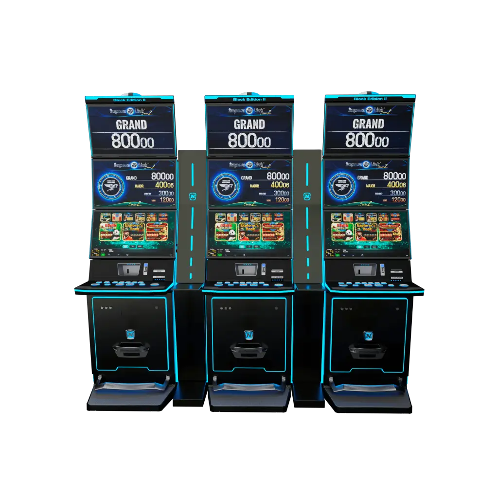 La serie de Impera Link, con el lema “Premios a lo alto”, presenta una revolución en la categoría de salones con su elegante diseño, iluminación LED y 3 pantallas integradas. El producto de NOVOMATIC, alojado en el espectacular mueble Black Edition II, introduce innovaciones como un elevador de monedas que permite integrar la bandeja en la botonera y mantiene la visión de juego a pesar de su altura.